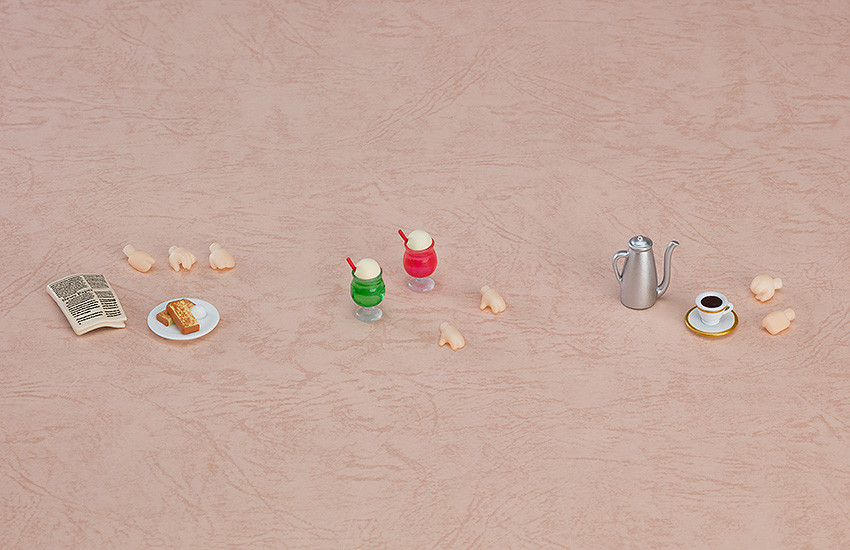 A café-themed parts collection comes to the Nendoroid More series! The Nendoroid More series was created to make Nendoroids even more enjoyable! The next item in the series is a collection of café-themed parts! Lineup (6 sets) Cream Soda (Melon) x1 + Cream Soda (Berry) x1 + Cream Soda Holding Hand (Left x2) Coffee Cup x1 + Cup Holding Hand (Right x1) + Kettle x1 + Kettle Holding Hand (Left x1) Breakfast Plate x1 + Plate Holding Hand (Left x1) + Toast Holding Hand (Right x1) + Newspaper x 1 + Newspaper Holding Hand (Left x1) Book x1 + Book Holding Hand (Left x1) ) + Lamp x1 Spaghetti x1 + Spaghetti Holding Hand (Left x1) + Fork x1 + Fork Holding Hand (Right x1) + Sign x1 Pudding x1 + Pudding Holding Hand (Left x1) + Spoon x1 + Spoon Holding Hand (Right x1) + Table Enjoy creating café scenes with your Nendoroids! Combine with the Nendoroid More Acrylic Stand Decorations: Café (sold separately) available for preorder from the same time! *May not be compatible with certain Nendoroids depending on the character design. depending on the character design.