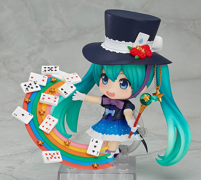 A Nendoroid to celebrate Magical Mirai’s 5th anniversary! From the “Character Vocal Series 01: Hatsune Miku” comes a new Nendoroid of Hatsune Miku based wearing the outfit used for the 2013 Magical Mirai key visual illustration! She comes with three face plates including a standard smiling face, a more serious smile with her eyes looking to the side as well as a cute smiling expression with a slight blush and closed eyes. Optional accessories include her trademark hat as well as her magic wand sculpted in beautiful detail. She also comes with colorful magic effect parts to display her performing magic, as well as parts that allow for a cute sitting pose! A special background plate drawn by the illustrator CHRIS is also included to really bring out the magic! Be sure to celebrate the 5th anniversary of Magical Mirai by adding this magical Miku to your collection!