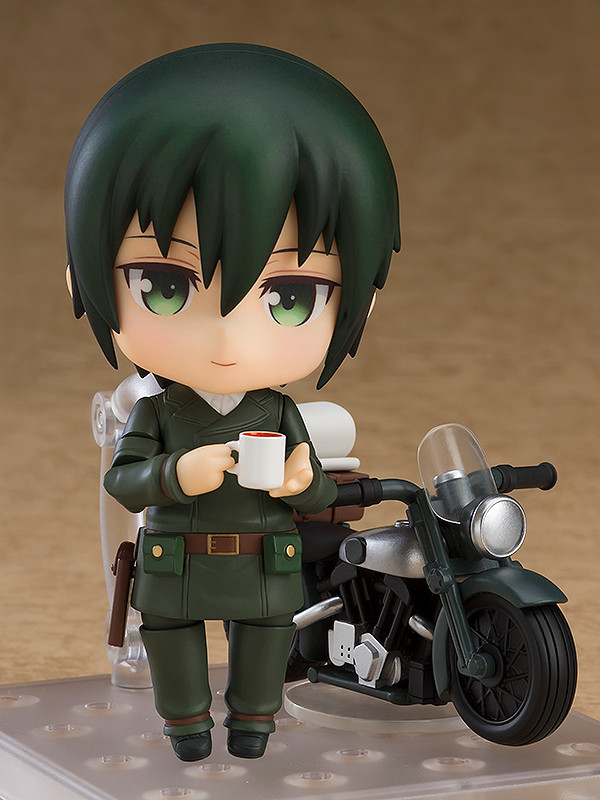 “This world is not beautiful. Therefore it is.” From the anime series “Kino’s Journey” comes a Nendoroid of Kino, the main character who travels the world with her talking motorcycle Hermes! She comes with both a standard face plate as well as a smiling face plate, and her large helmet complete with goggles can also be attached and removed allowing for various different situations. Hermes is also included with the Nendoroid and Kino can even be displayed riding the faithful motorbike! Other optional parts include a variety of weapons she used in the series including Canon, Woodsman and Flute, and she also comes with a cup to display her taking a little break along her travels!