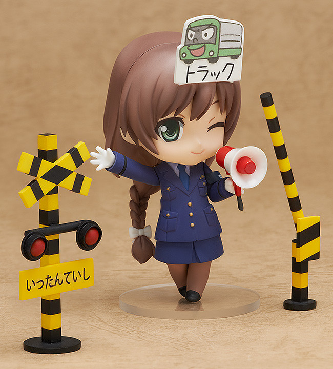 A member the railway police team, Sakura Monden! From ‘Tetsudou Musume’ comes a Nendoroid of Sakura Monden wearing her ‘Railway Police’ armband and ready to keep the stations and railways safe! She comes with a railway crossing set used during train safety explanations at schools, as well ‘pedestrian’, ‘truck’ and ‘train’ mask cutouts to wear on her head – display Sakura teaching everyone about train safety! While previous figures in the series included a ‘cardboard box train’, Sakura instead comes with a cardboard police patrol car! Just like the previous figures she still comes with a rope to share the fun with other characters in the series as well! Be sure to display her with Nendoroid Minami Kurihashi who will be going on sale at the same time! ♪