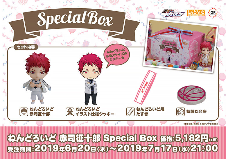 A special package version of Nendoroid Seijuro Akashi! A special version of Nendoroid Seijuro Akashi, so you can spend a special day together! Along with Nendoroid Seijuro Akashi, a sash with one of his famous lines from the show and a cookie with an illustration of Seijuro in his school uniform printed on it are included! Everything comes in a special edition box. Set Contents: Nendoroid Seijuro Akashi Special round base Nendoroid-sized sash Cookie with illustration in Nendoroid style Box