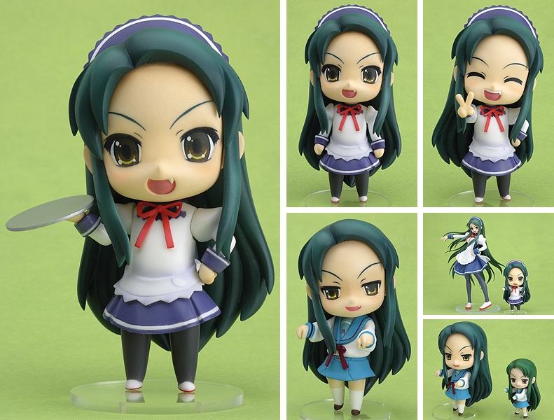 It’s the mega-cute Nendoroid, Tsuruya-san! Tsuruya-san, famous consultant to the SOS Brigade, gets super-deformed in this, the fourth Haruhi Nendoroid. In addition to her normal face, she includes her puppet face, as seen in Asahina Mikuru’s Adventures episode 00, as well as a laughing face. She also comes with several bonus parts to complete the puppet motif, as well as to change her into her maid uniform from the school festival, complete with a tray for serving drinks. Her headband can also be removed and replaced with pieces from the other Haruhi Nendoroids. Line them all up together to recreate any scene from the show!