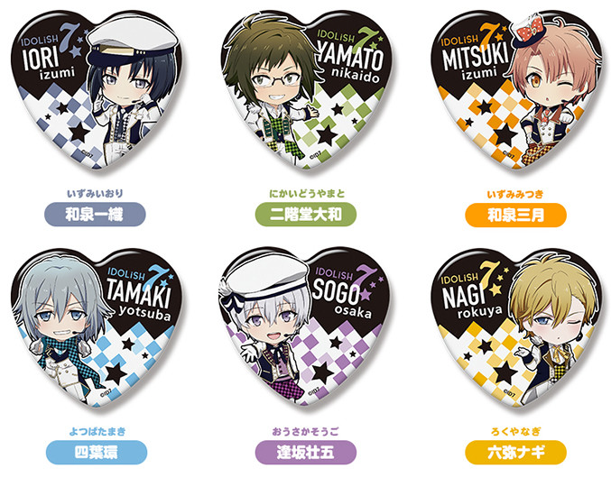 Heart-shaped IDOLiSH7 badges to collect! From IDOLiSH7 comes a selection of collectible heart-shaped badges featuring the cute Nendoroid illustrations of characters! There are a total of twelve to collect! * 1 boxset contains 14 different badges. A boxset will always contain at least one of each type. * This product is a collectible product where each single purchase will contain one random product. * This product will be on sale prior to release at AnimeJapan 2017 taking place on the 23rd March – 26th March 2017 Gift Official Site http://gift-gift.jp/