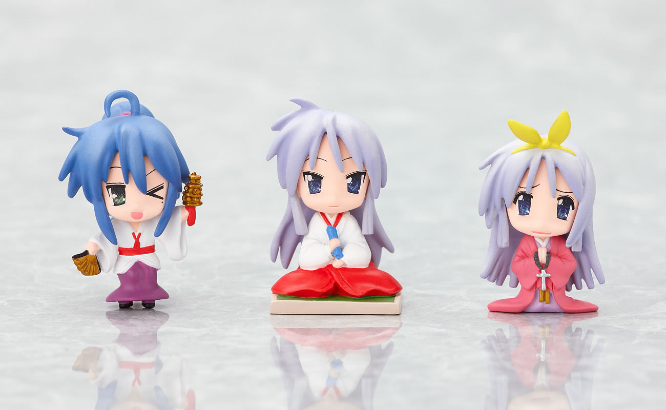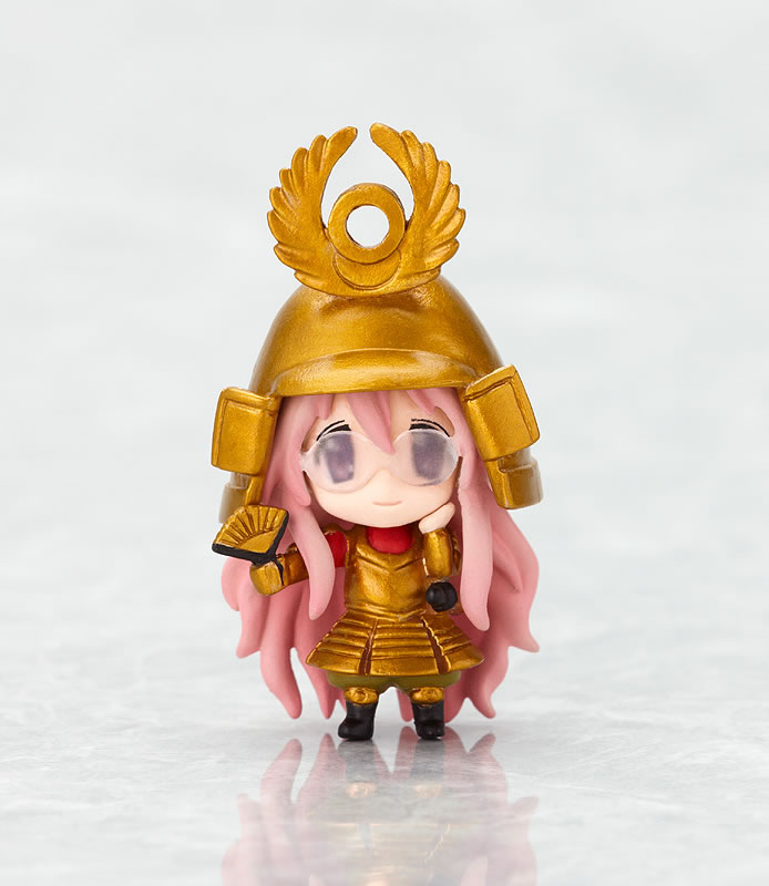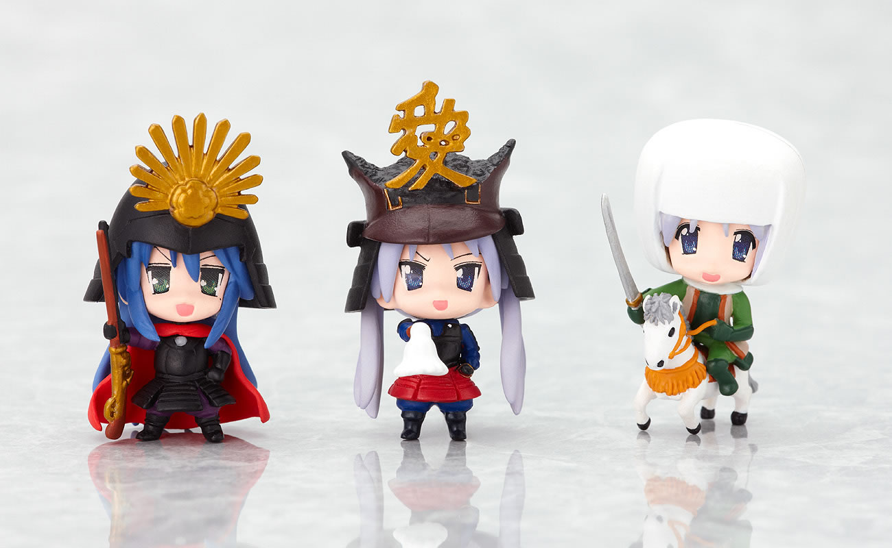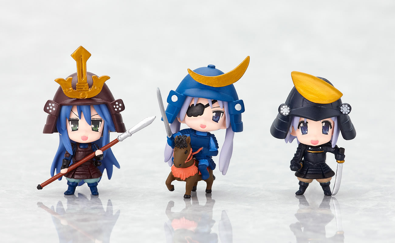 Military cosplay from the Sengoku era! The miniature charm sets that are even smaller than the normal Nendoroid Petite figures are back in animate and Gamers stores again! A separate set of each of the three heroines of Lucky Star will each be sold in various areas around Japan – each cosplaying famous commanders from that area. Wearing the characteristic armor or clothing of various different commanders, the Lucky Star girls make a total of 18 mascots, and each of these mascots are sold as both a netsuke and a miniature charm. Additionally, an extra charm of Miyuki Takara is included in the full set available through mail order.