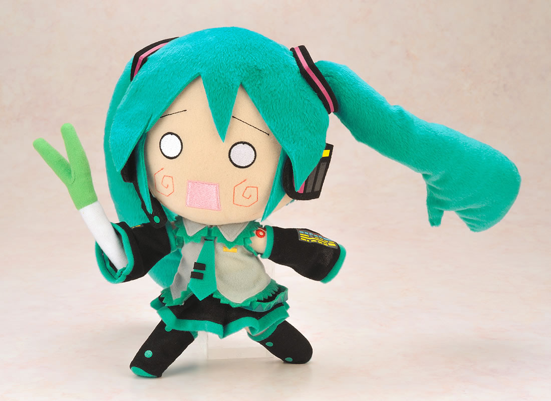 A plushie series you can pose however you want! A resale of the Hachune version is accompany the original! Where there is Miku Hatsune, there has to be a Miku Hachune to join her! This version of the Miku plushie has the classic ‘Hachune’ expression and comes complete with a leek to wave around! Joints are located inside the plushie, allowing it to be posed in different ways, such as sitting and waving her leek around! Display her however you prefer! ♪